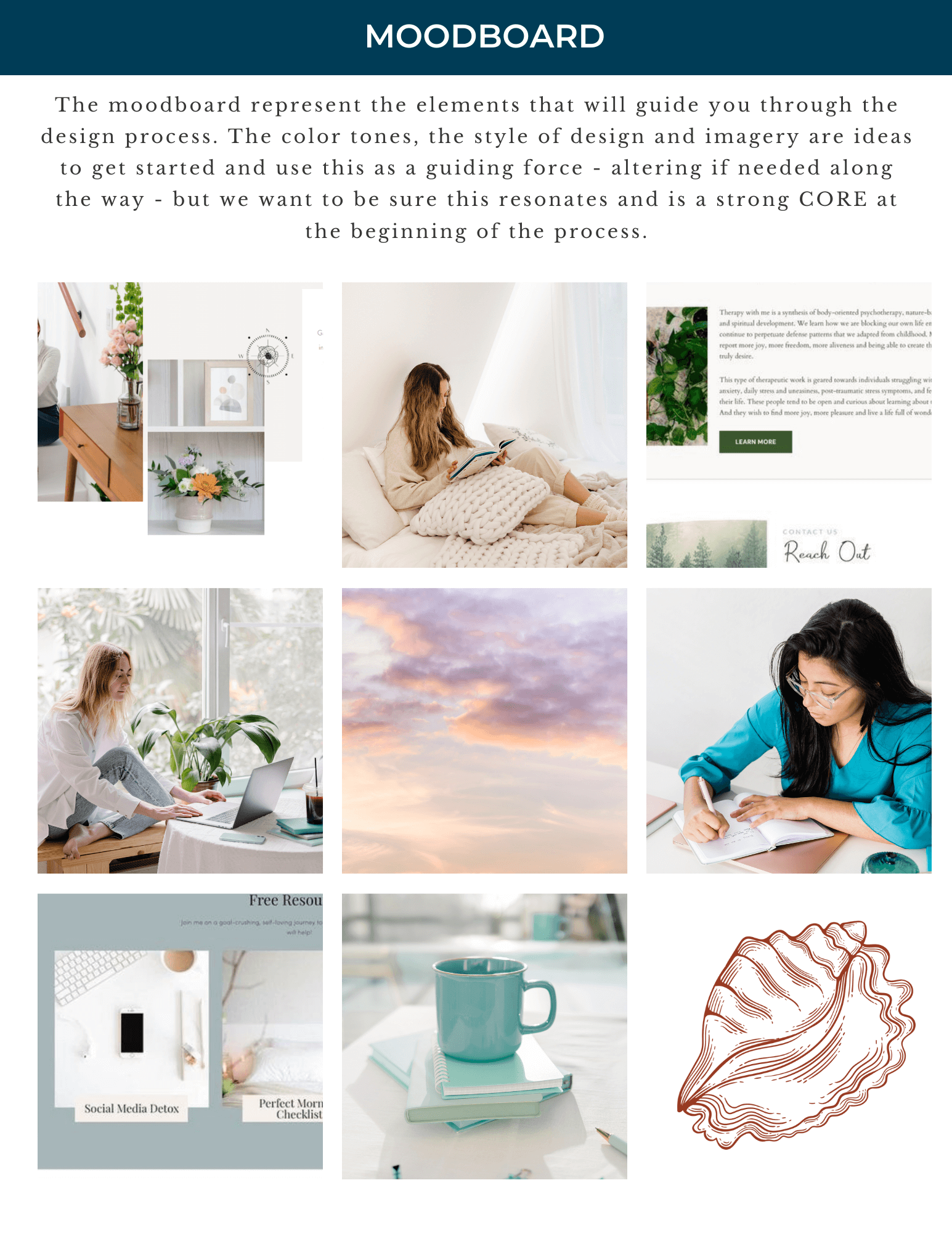 Each of these individual pieces is part of the greater vision for how we’ll pull everything together in the homepage mockup. I like to tell clients to look at the moodboard as a whole to make sure the tone and image style fits with their ideas and to take a look at the design elements because those will guide how I layout different sections of the website.