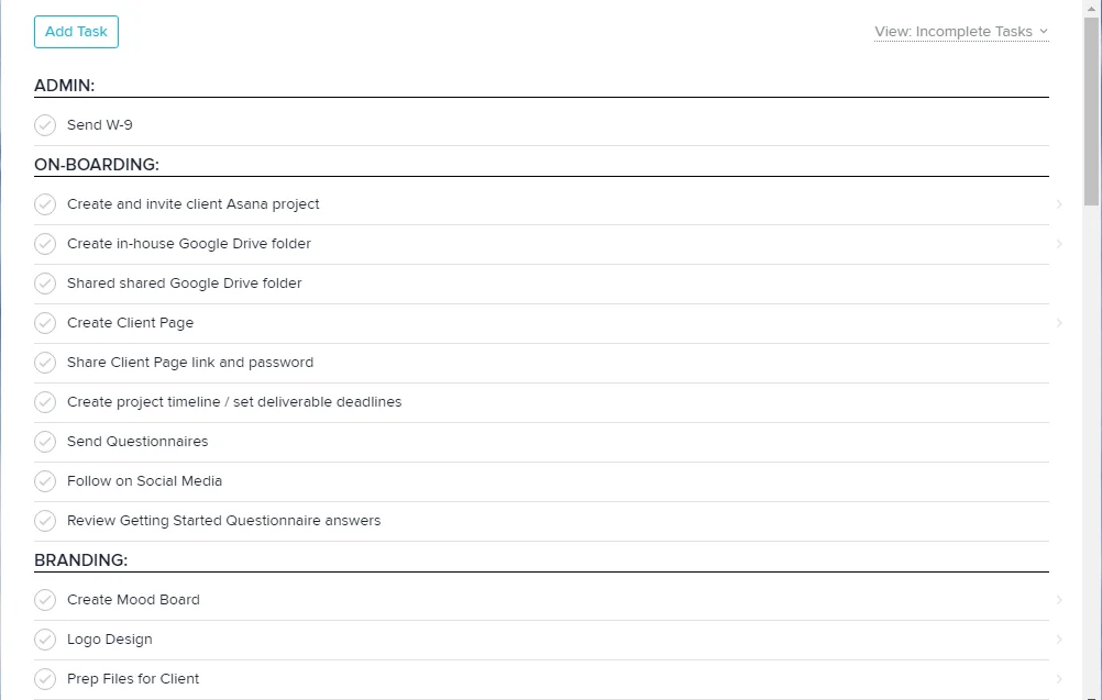 I also have an in-house version of the project in Asana that keeps me on track and outline every step of the project. This allows me to stay organized without my clients seeing all the behind-the-scenes tasks that they don't need to complete (because you really don't need to see link testing and every type of mobile device being developed individually).