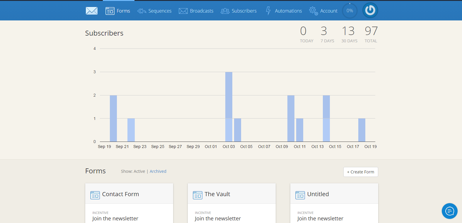 Once you've created an account, you'll see your Dashboard. Here you can see how many subscribers you have and how each of your forms are performing. In order to create a new Form, click +Create Form.