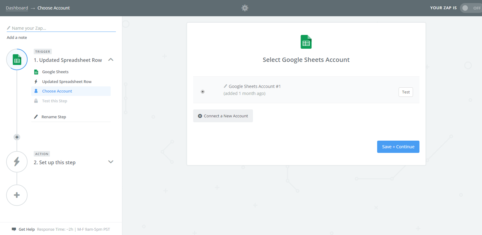 Your first step will be to create a Trigger. Do this by selecting Google Sheets from the Apps and choosing Updated Spreadsheet Row. Save and Continue.