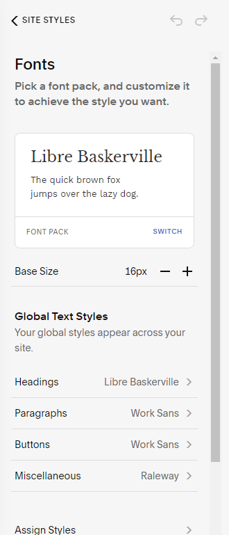 If you’re using Squarespace 7.0, you’ll adjust all these settings in the Design > Site Styles panel. There will be options for paragraphs and each heading types (1-3).