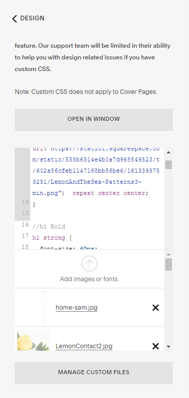 2. Upload the font to Squarespace in the Design > Custom CSS > Manage Custom Files.