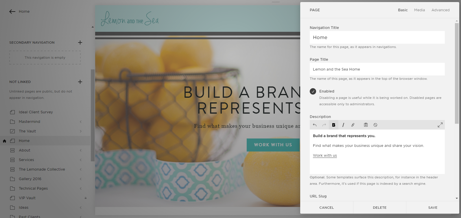 For example, my Navigation Title is "Home," which is standard and short for people moving around my website, but my Page Title is "Lemon and the Sea Home" which makes it easier for search engines to find my website and tells searchers what they will find on the page. I could also make my Page Title something like "Lemon and the Sea Graphic Design Richmond VA" for even more information.