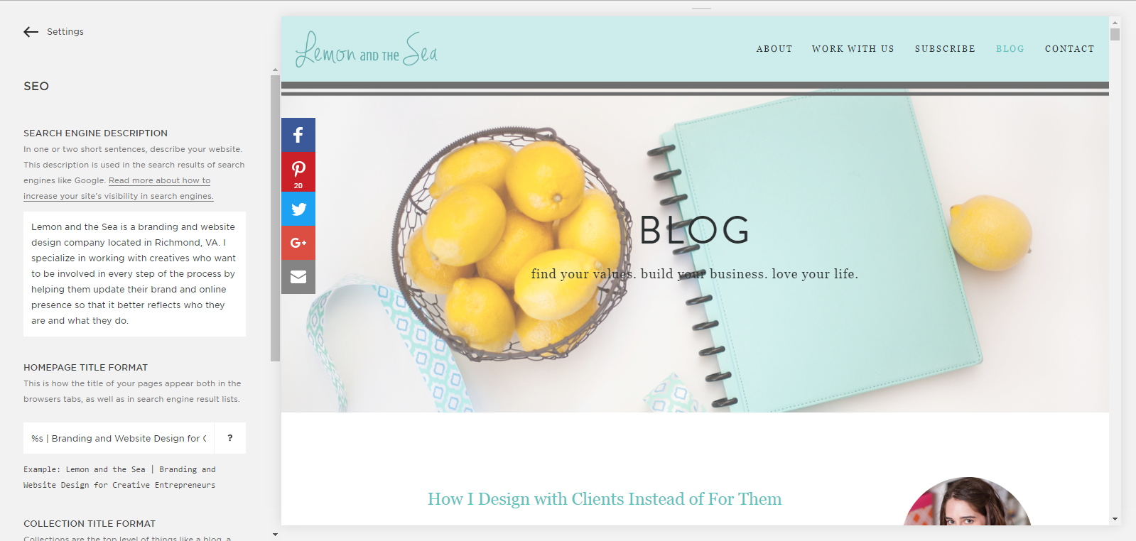 Squarespace also makes it easy to add a search engine description separately from the other descriptions (Settings > SEO). This is the description that will show up under your website name on Google. In this section, you can also change how you page titles are formatted for Google. (I added "Branding and Website Design for Creative Entrepreneurs" after my website title for some added SEO and to make it clear what I do when someone finds my website through a search engine.